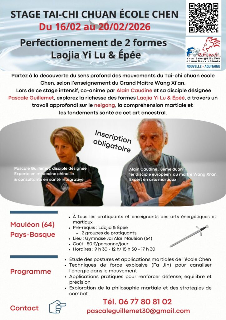 Ce stage intensif s’adresse aux pratiquants et enseignants d’arts énergétiques et martiaux, avec comme thèmes : Épée et Laojia Yi Lu. Il se déroulera au Gymnase Jaï Alaï à Mauléon (64) et sera co-animé par Alain Caudine, 8ème duan et 1er disciple européen du Grand Maître Wang Xi’an, et Pascale Guillemet, sa disciple désignée, experte en médecine chinoise et consultante en santé intégrative.